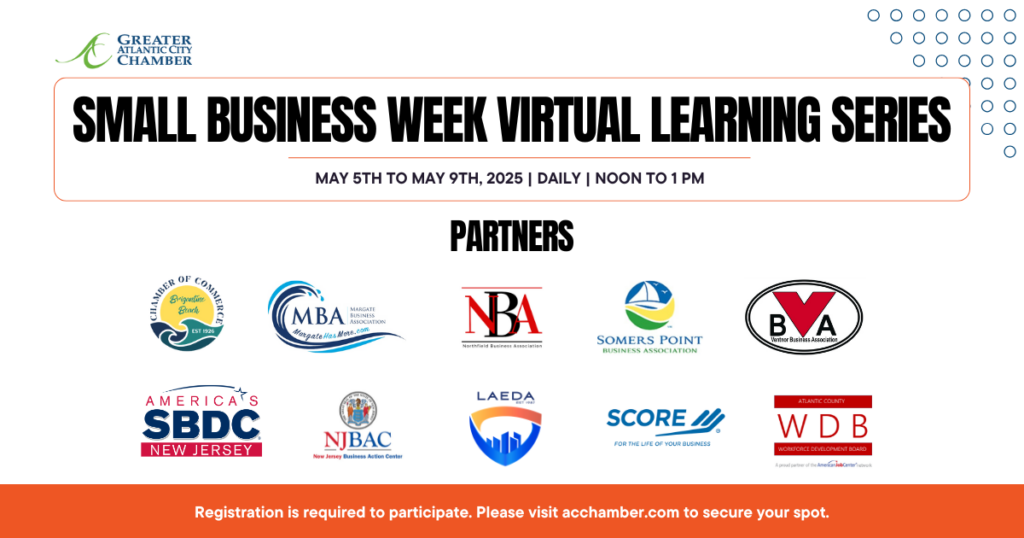 The Greater Atlantic City Chamber of Commerce, in partnership with business associations across Atlantic County, will host a virtual lunch and learn series in celebration of Small Business Week, May 5 to 9, 2025. This collaborative initiative brings together the Margate Business Association, Brigantine Chamber of Commerce, Northfield Business Association, Ventnor Business Association, and Somers […]