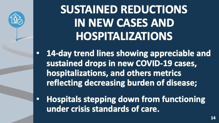- 14-day trend lines showing appreciable and sustained drop in new COVID-19 cases, hospitalizations, and other metrics reflecting decreasing burden of disease;