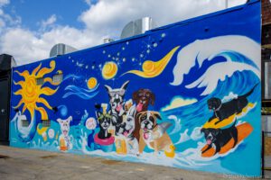 After an extensive renovation to the 5000 sq. ft space, two-story building, Good Dog has created a hip and inviting vibe with help from local artists. Mud Girls Studio has created a very cool tile dog-themed mural that complements the black and white photos of favorite pooches. A full wall mural of dogs on surfboards and mugs of beer beckon customers at the beer garden. The exterior of the building features civil rights icons Fannie Lou Hamer, Muhammad Ali, and Martin Luther King Jr.